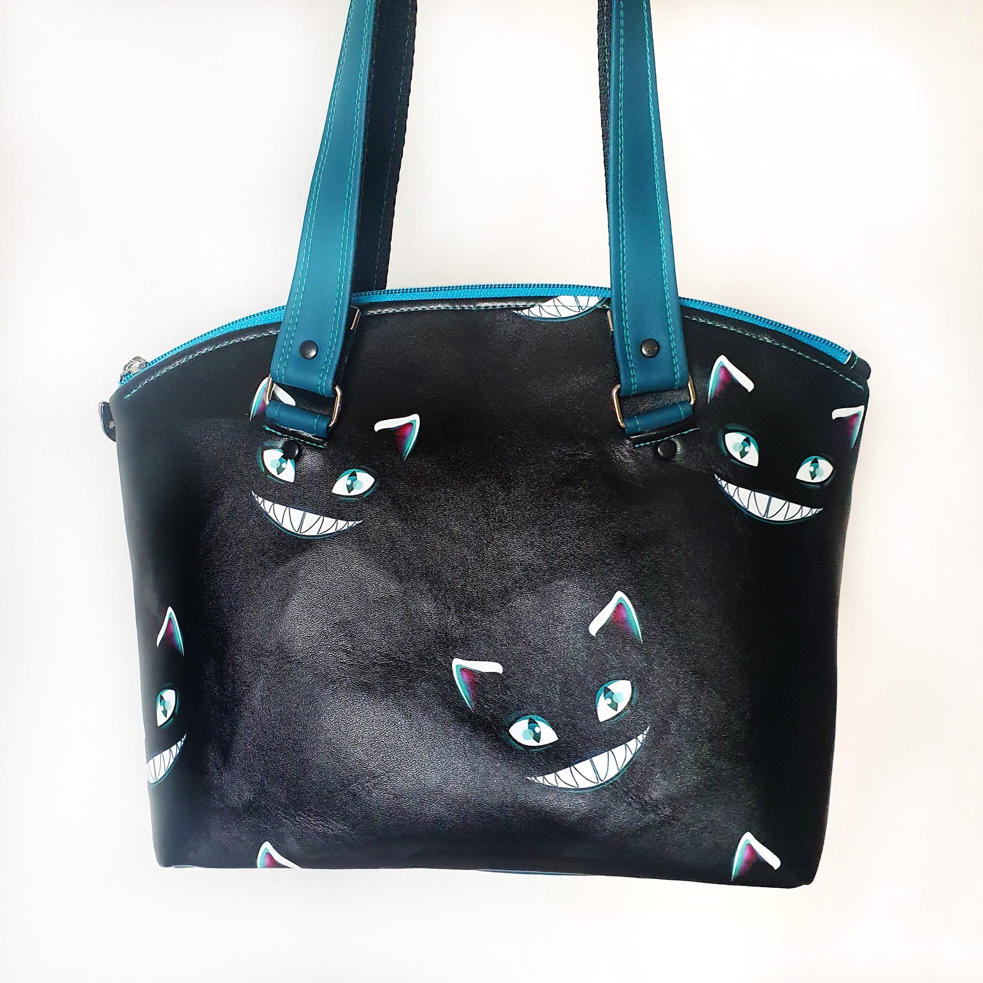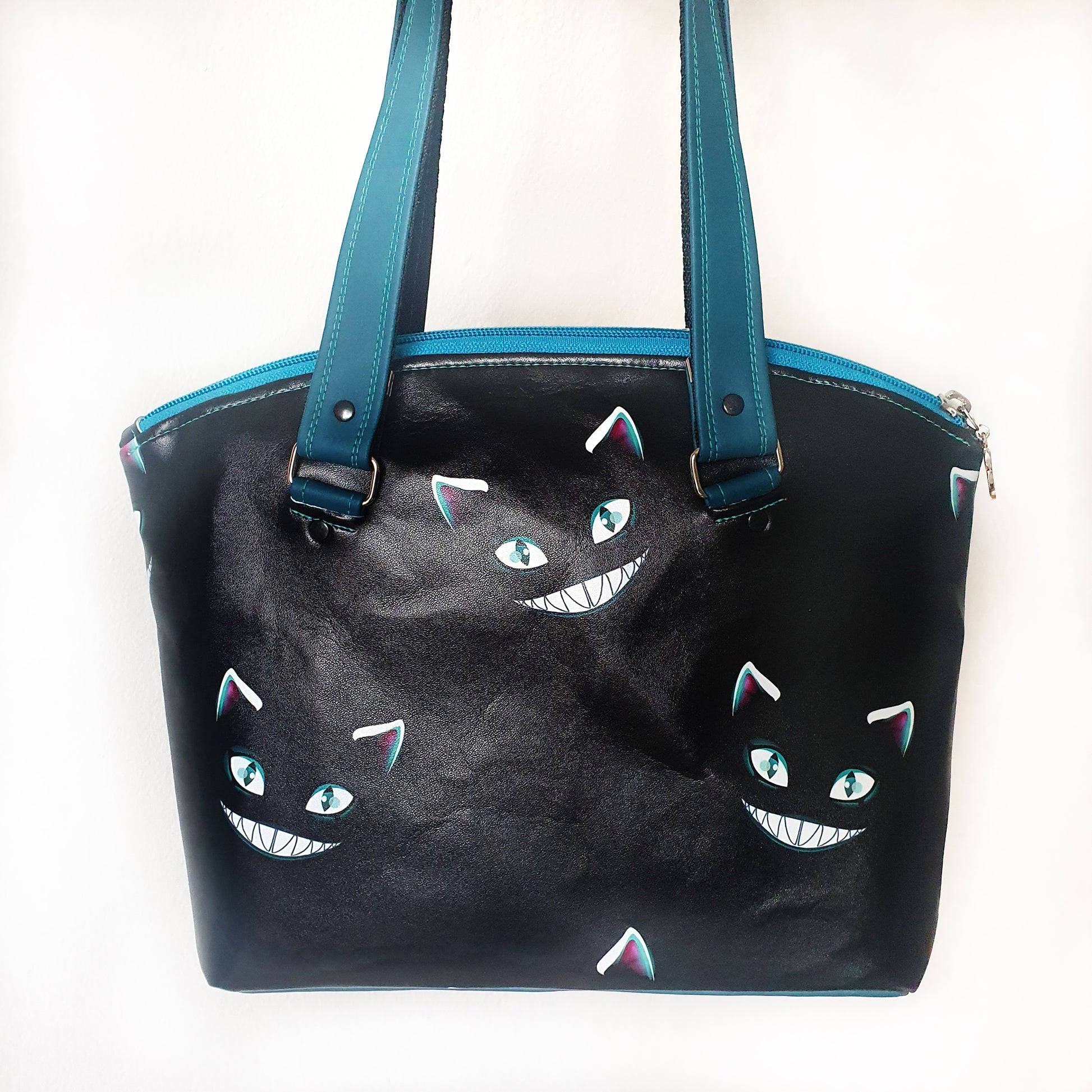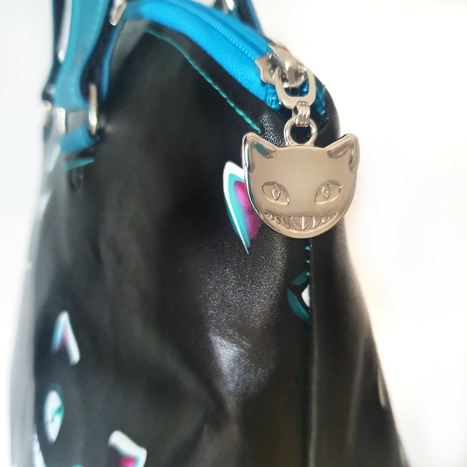 - bedrucktes Kunstleder mit grinsender Katze außen (schwarz)