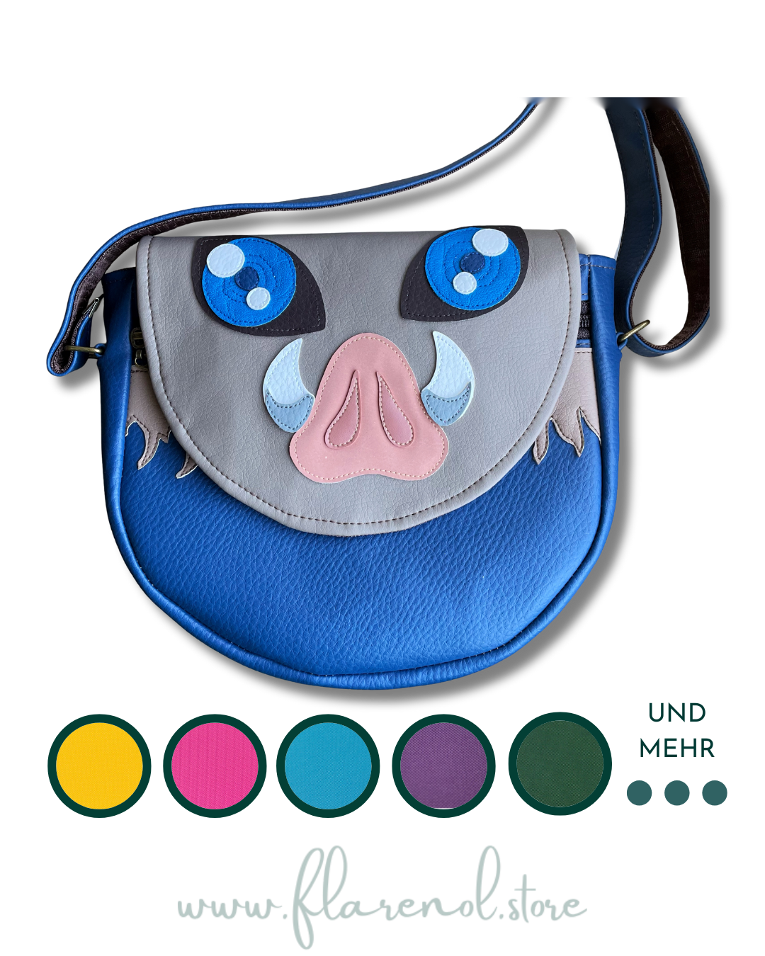 Diese handgefertigte Umhängetasche ist ideal für Handy, Geldbörse und kleine Essentials. Die Außenseite ist komplett aus Kunstleder gefertigt, auf der Klappe wurde die für Inosuke typische Maske aus Kunstlederteilen appliziert.
