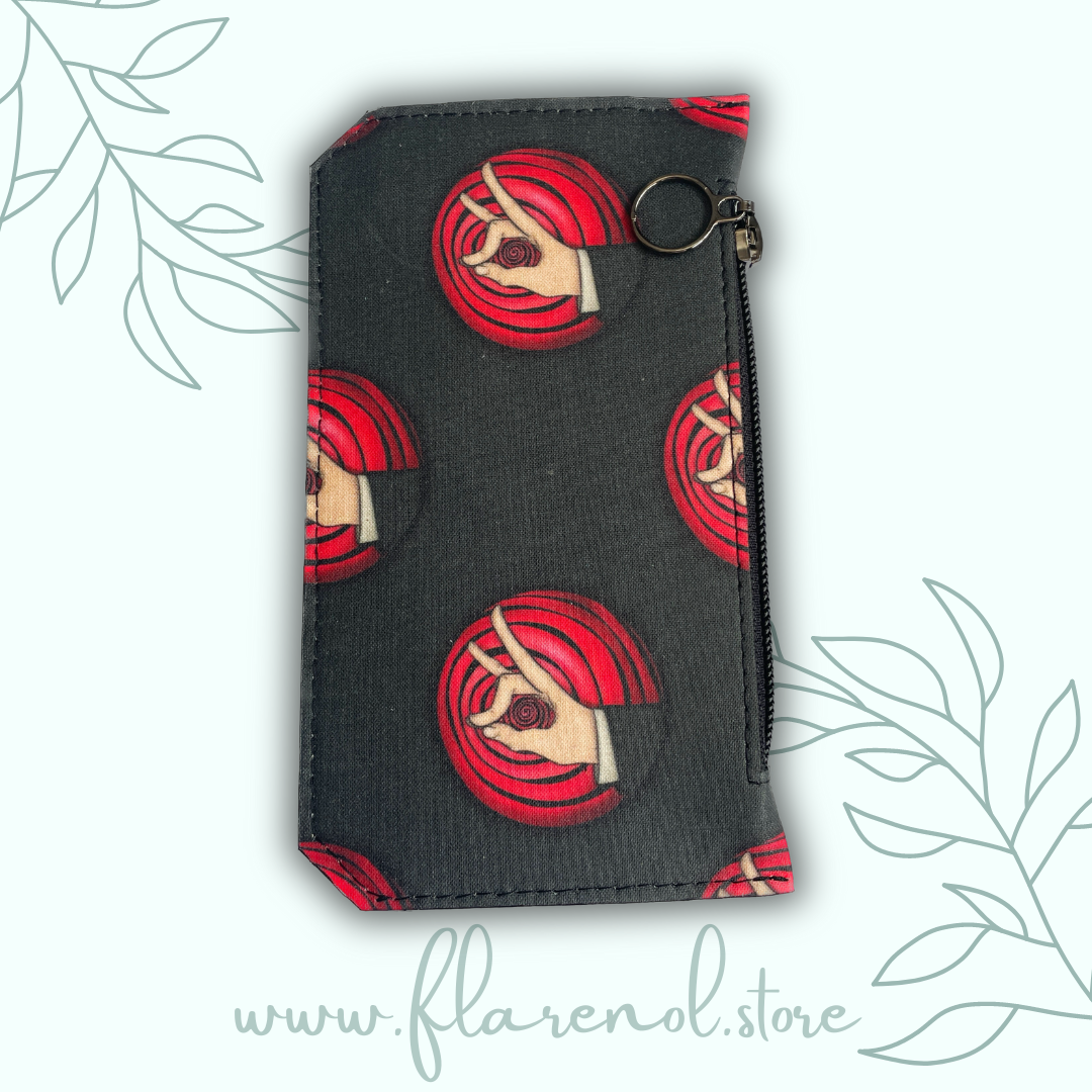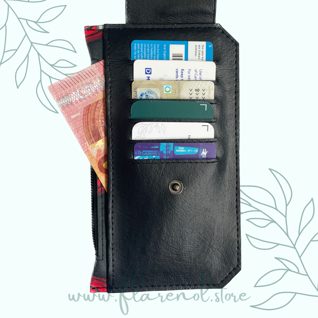 Kleines, nützliches Etui aus Kunstleder mit 6 Kartenfächern und Motivprint auf der Rückseite, Steckfach für Geldscheine und Reißverschlussfach für Münzen.